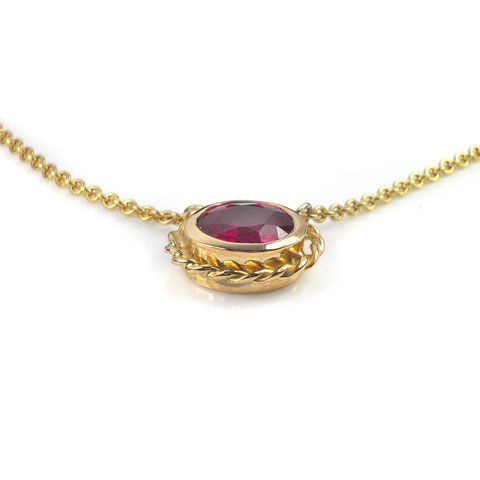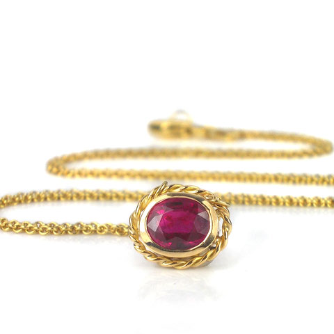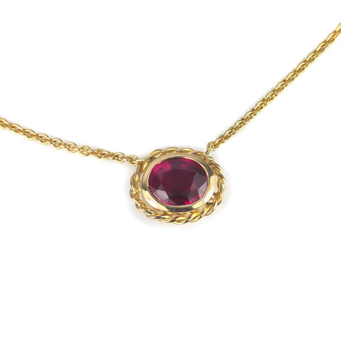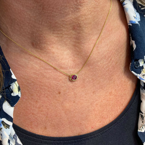 Warme Farben für den Herbst: Unser neues Collier in Gelbgold 750/000 mit einem herrlichen purpur-farbenen Rubin (heated) 5.8 x 4.7 mm oval mit 0.66 ct., € 2.349,00.