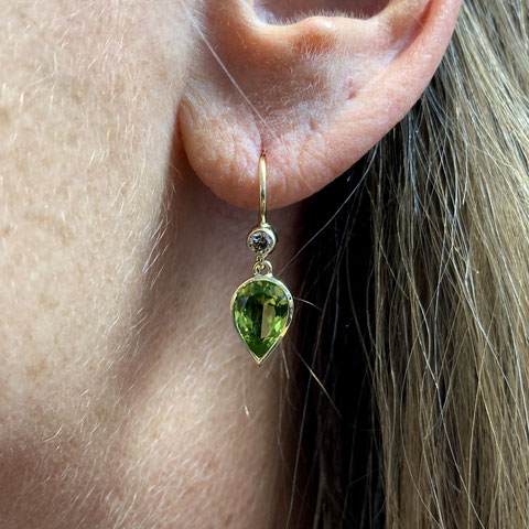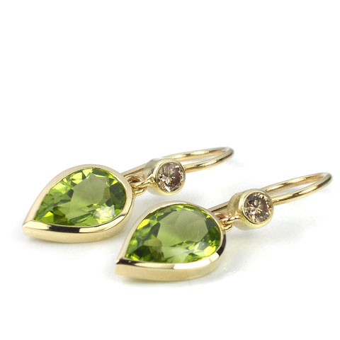 Neue Ohrhänger in frischem Grün und warmem Zimt: Sattes Gelbgold 585/000 umschließt die beiden 10 x 7 mm großen Peridot-Tropfen mit zus. 4.04 ct., darüber sitzen die naturfarbenen Brillanten mit insgesamt 0.31 ct. SI1, € 2.498,00/Paar.